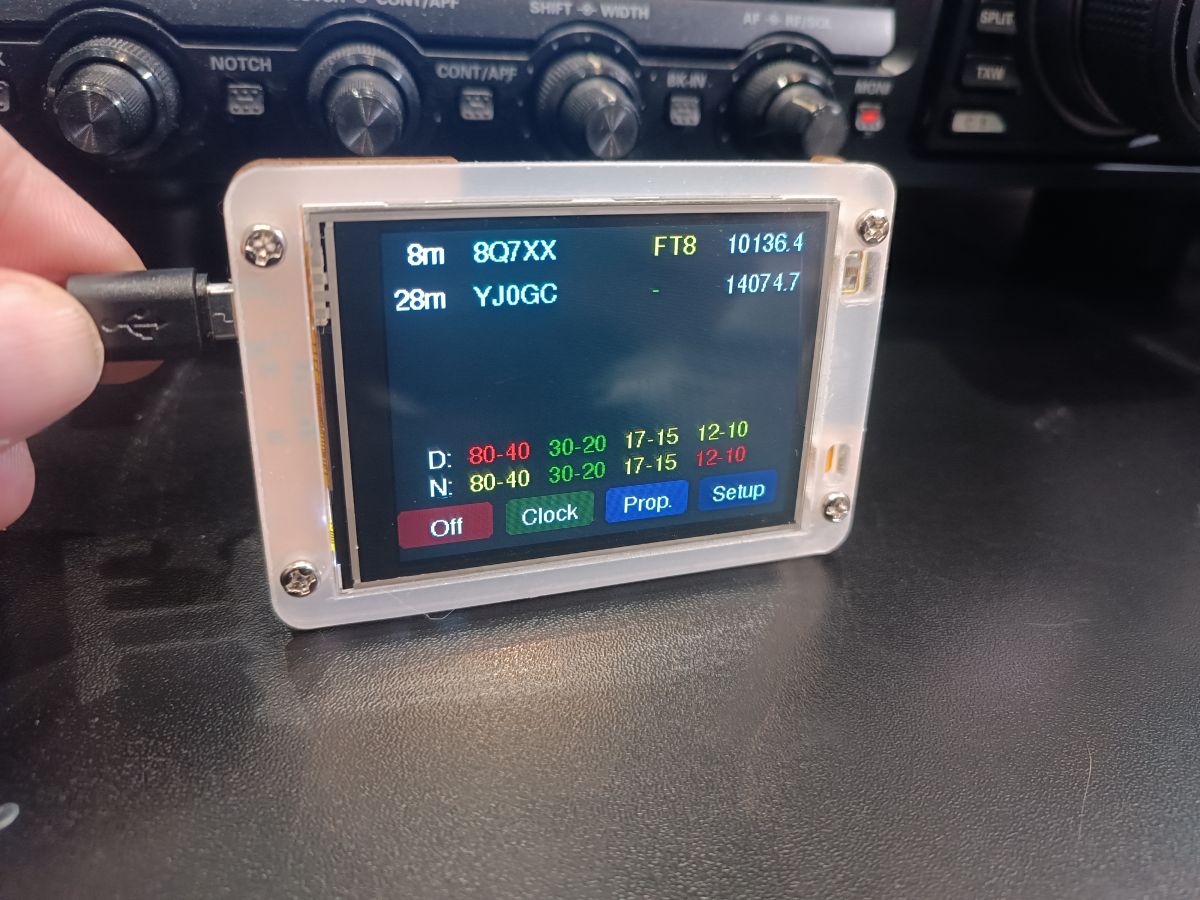 Z oryginalnych kodów nie zostało prawie nic, przede wszystkim zmieniłem bibliotekę wyświetlacza z Adafruit_ILI9341 na TFT_eSPI, co przyspieszyło jego działanie chyba 100 razy. Głośniczka na razie nie testowałem, bo nie znalazłem takiego konektora. Zostało jeszcze całkiem sporo pamięci do wykorzystania, bo ok. 150 kB, więc gdyby ktoś miał jakieś pomysły, to zapraszam. Mam problem z kolorami w monitorze propagacji HAMqsl dla różnych wartości, nie znalazłem nigdzie dokumentacji, dla jakich kolory są ustawiane na zielony, żółty i czerwony, porównuję na razie na bieżąco. Gdy wszystko dokładnie przetestuję i opiszę, to wrzucę źródła programu na GitHuba z opisem instalacji.