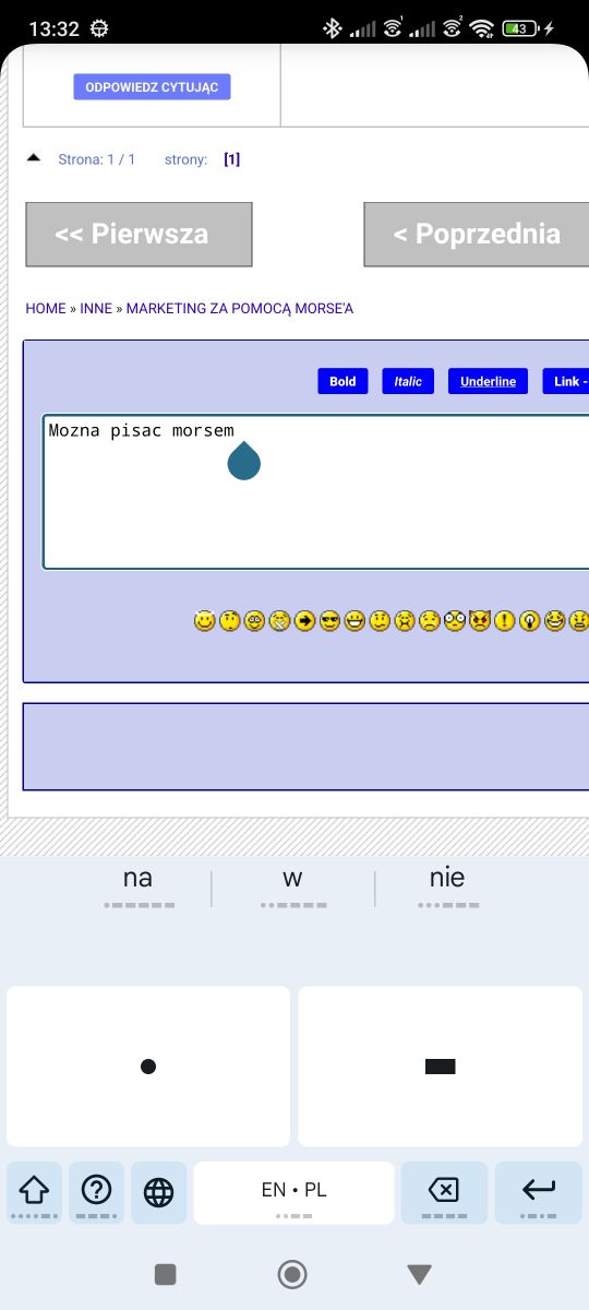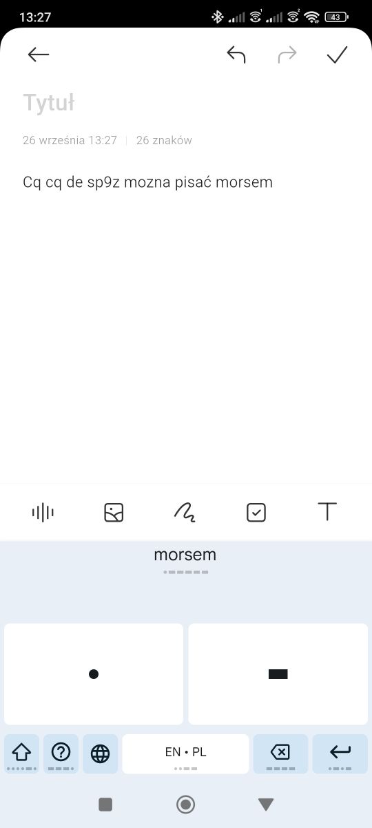Jeżeli masz telefon z androidem, klawiaturę Gboard, możesz pisać SMSy i inne wiadomości morsem. Jest to trochę upierdliwe, ale jak najbardziej możliwe. Co więcej , możesz pisać tutaj na forum, używając klawiatury Morsea Taka ciekawostka bardziej