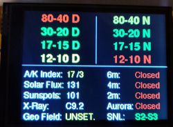 - Monitor propagacji z HAMqsl.com: w widoku uproszczonym tylko podgląd warunków dla pasm KF w podziale na dzień i noc oraz w widoku rozszerzonym szczegółowy panel danych. Jest możliwośc włączenia sygnału dźwiękowego po pojawieniu się nowego spota, ale trzeba dołączyć głośniczek).