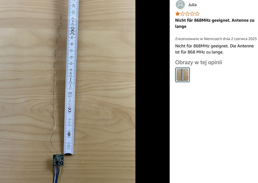 Ilość edycji wpisu: 1 | Odnośnie anten helikalnych. Szukałem ostatnio na Amazon modułów odbiornika CC1101 na 868 MHz. To jest taka malutka płytka z dodaną antenką helikalną w komplecie. Wśród opinii o tym module znalazła się jedna, wystawiona przez Julię (z Niemiec). Wystawiła ona jedną gwiazdkę, bo "antena była za długa na 868 MHz". Dodała zdjęcie tej anteny.